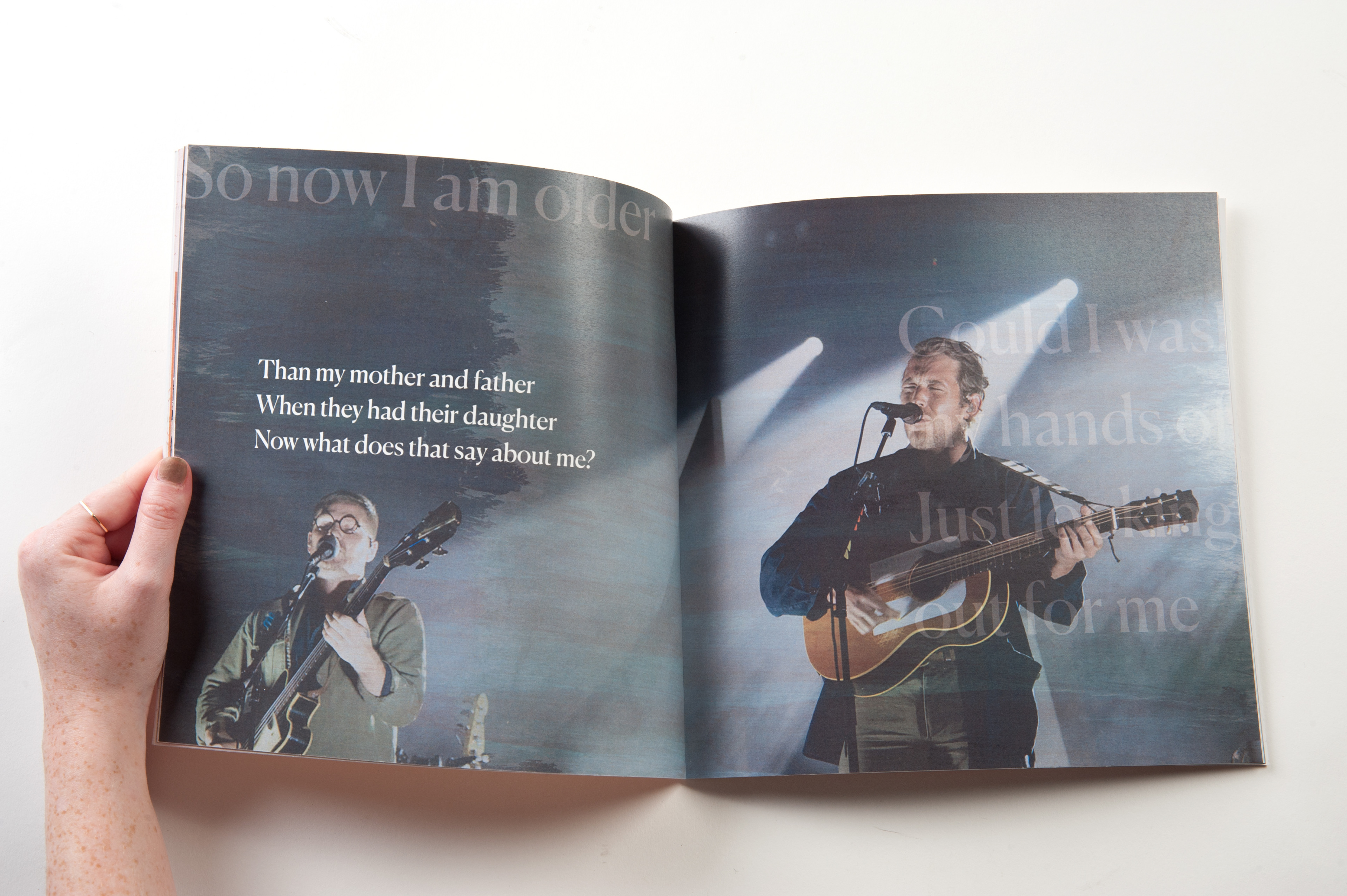 Lyric sheets are included for each album so the listener can take a closer look at the lyrics. A personal essay is used as the copy for the catalogue, lyrics are used as pull quotes since they are integral to the band's music.